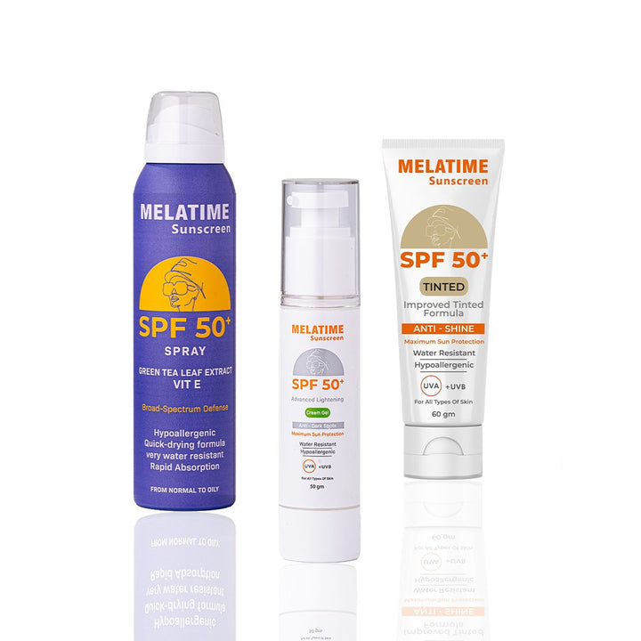 احصلي على بشرة محمية وموحده مع بندل ميلاتايم المكوّنة من: التينتيد صن سكرين، السبراي، والكريم چل لتفتيح التصبغات.