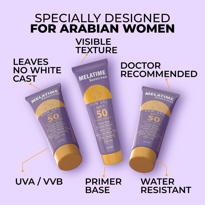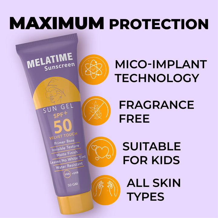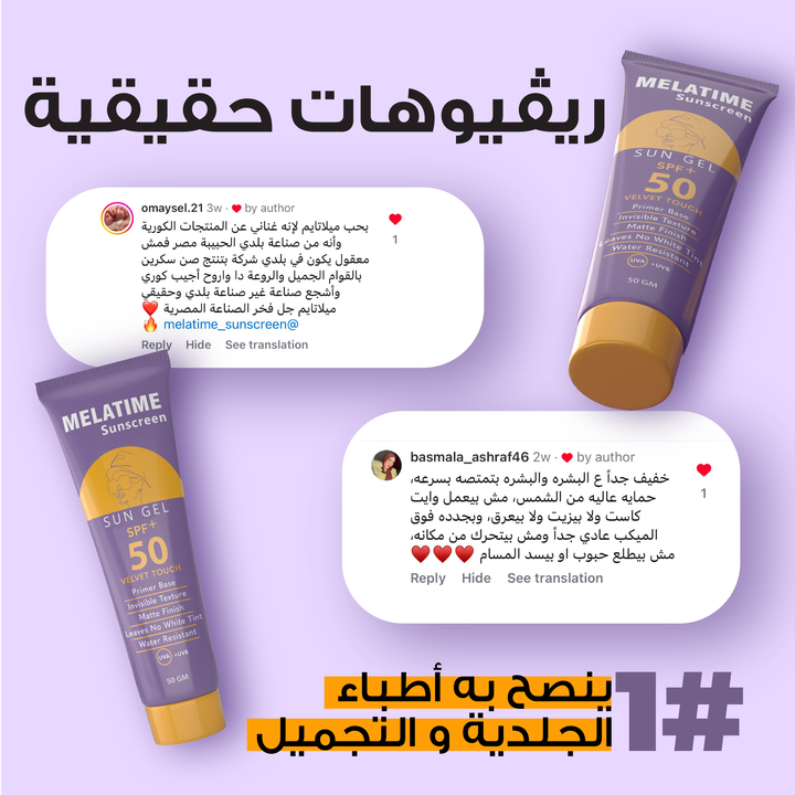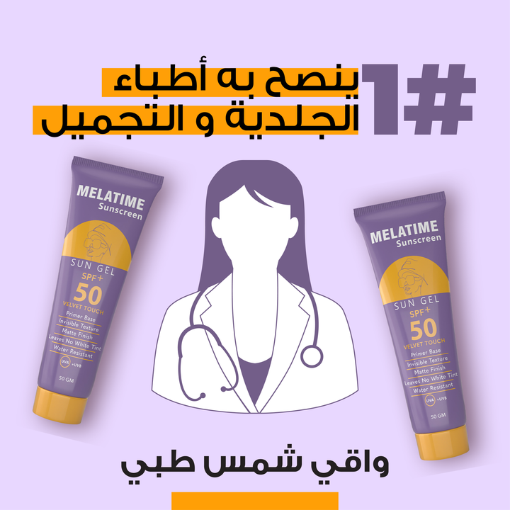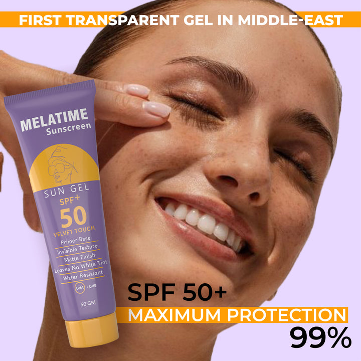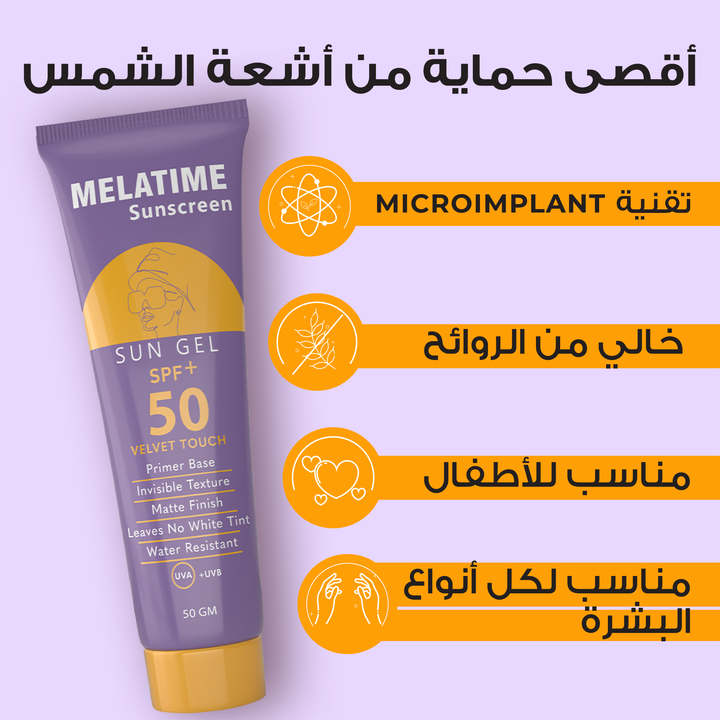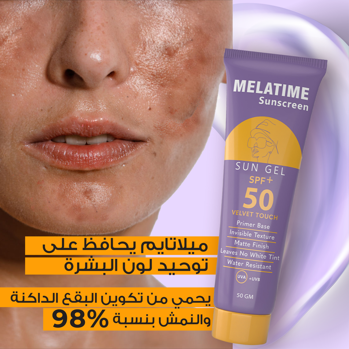 ميلاتايم صن سكرين جل بعامل حماية +SPF 50 لحماية عالية، مناسب لجميع أنواع البشرة وخاصة البشرة الدهنية والمعرّضة لظهور الحبوب. بتركيبة أساس برايمر، ملمس غير مرئي، لمسة نهائية مطفية، لا يترك أي أثر أبيض على البشرة، مقاوم للماء والعرق.